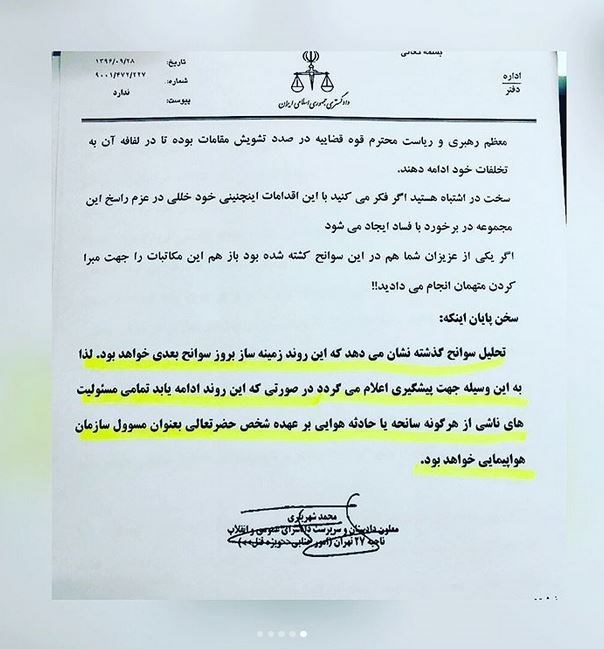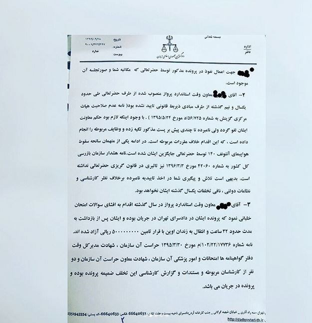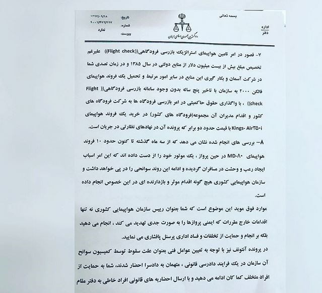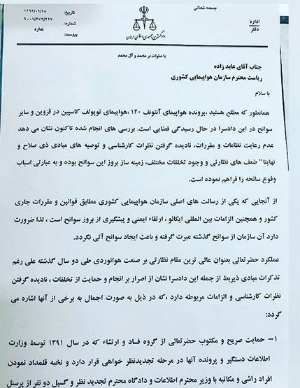 تصاویر زیر، مربوط به نامه قاضی شهریاری به عابدزاده رئیس وقت سازمان هواپیمایی کشوری است.