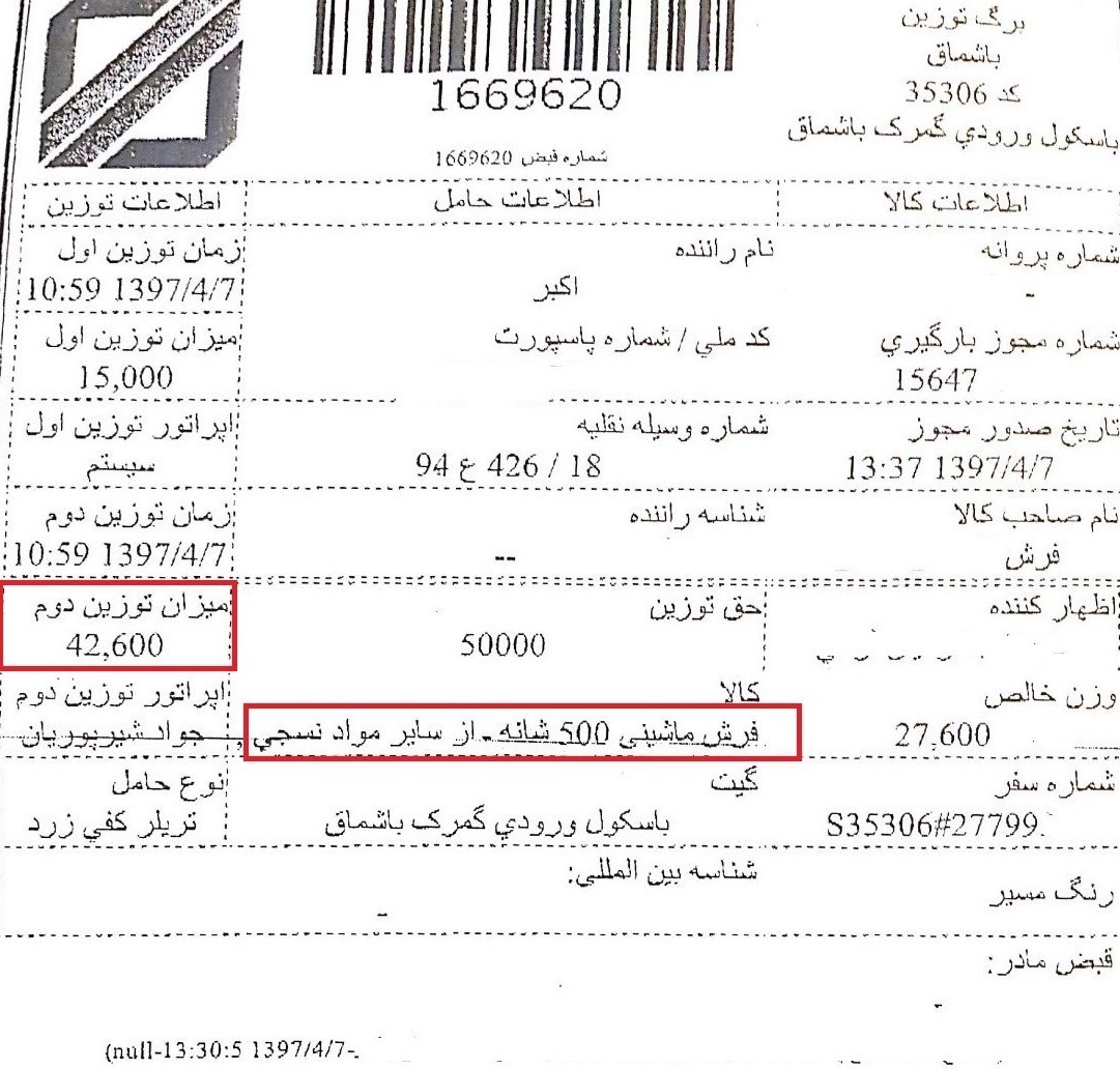 بر این اساس یک شرکت تولیدی، محموله سنگ را فرش 500شانه اظهار کرده که در ادامه اظهارنامه و برگ توزین (باسکول ورودی) آن قابل مشاهده است. بعد از کشف این موضوع  توسط گمرک علیه شرکت متخلف اعلام جرم انجام شده و مراحل قضایی رسیدگی به تخلف مذکور در دادستانی مریوان در دست اجرا می‌باشد.