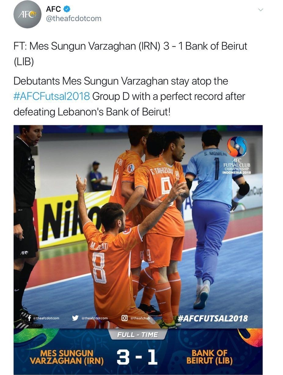 به گزارش خبرگزاری تسنیم، تیم فوتسال مس سونگون در سومین و آخرین دیدار خود در مرحله گروهی مسابقات فوتسال قهرمانی باشگاههای آسیا، با نتیجه 3 بر یک از سد بانک بیروت گذشت تا در اولین حضور خود در این رقابتها، به عنوان صدرنشین گروه D به مرحله یکچهارم نهایی راه یابد. مس با این سه برد، در همه دیدارهای خود در قهرمانی باشگاههای آسیا به پیروزی رسیده است.