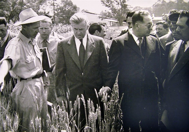 نورمن بورلاگ به همراه هنری والاس وزیر سابق کشاورزی و معاون رئیسجمهور آمریکا و مارتیر وزیر کشاورزی مکزیک در مزرعه «دفتر مطالعات ویژه» در دهه 1940 میلادی