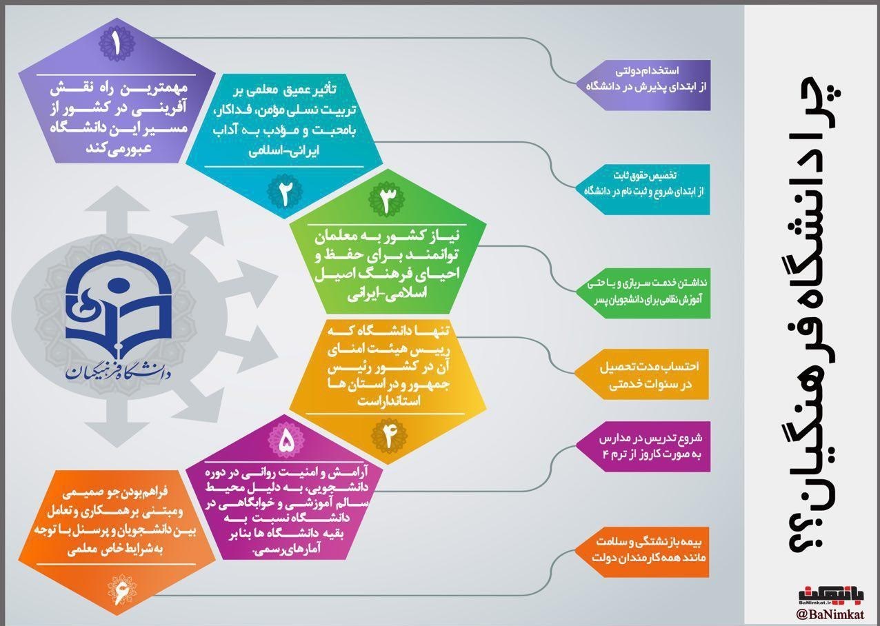 رئیس دانشگاه فرهنگیان بیان کرد: افردی که در کنکور سراسری دانشگاه فرهنگیان را انتخاب میکنند باید بدانند که برای آنها فرصت اشتغال رسمی فراهم است و آنها از مزایایی برخوردار هستند از جمله اینکه سربازی پسرهاحذف میشود و دوران تحصیل که 4 سال است جزو سوابق کاری افراد محسوب شده و حین تحصیل حقوق دریافت میکنند.