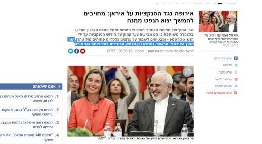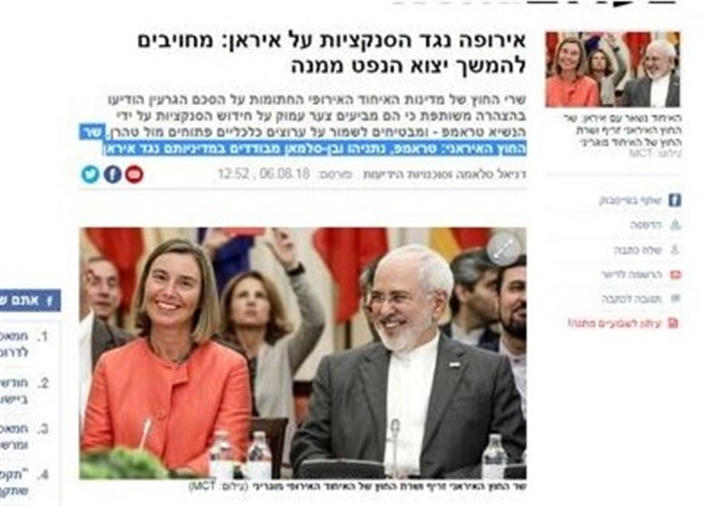 روزنامه یدیعوت آحارانوت در تحلیلی که روز 8 آگوست به قلم یوری گولدبرگ منتشر کرد ضمن انتقاد شدید از رویکرد دولت آمریکا و پایکوبی اسرائیل به خاطر تحریم ها علیه ایران با اقتباس از گفته وزیر خارجه کشورمان نوشت : "تحریم های اعمال شده واشنگتن علیه تهران بیش از هر چیز ایالات متحده، اسرائیل و پادشاهی عربستانی را به انزوا می برد ، زیرا آنها را به عنوان طرف های تشنه قدرت در جهان نمایان کرده است".