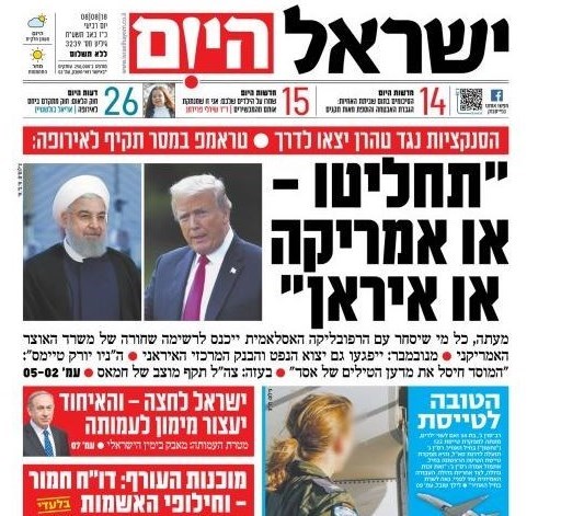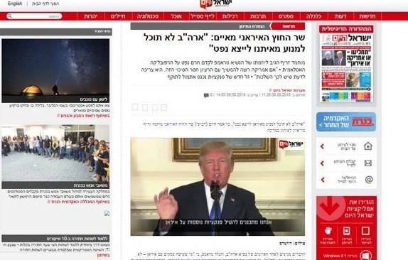 روزنامه یسرائیل هیوم هم در گزارشی به مناسبت از سرگیری تحریم های علیه کشورمان به نقل از محمد جواد ظریف خبر داد آمریکا اگر به دنبال محقق کردن این طرح خود باشد باید این امر را هم در نظر بگیرد که چنین اقدامی تبعات خود را هم در پی خواهد داشت.