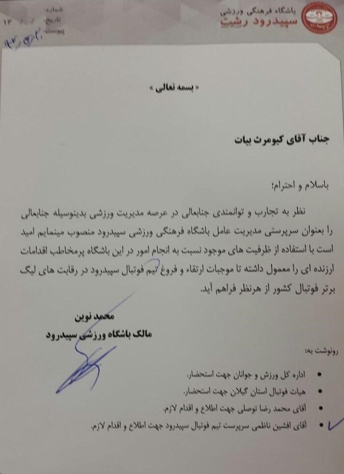 به گزارش خبرنگار ورزشی خبرگزاری تسنیم، محمد نوین، مالک باشگاه سپیدرود پس از حاشیههای چند روز اخیر این تیم، محمد توسلی مدیرعامل این باشگاه را برکنار و کیومرث بیات را به عنوان سرپرست جدید باشگاه سپیدرود منصوب کرد.