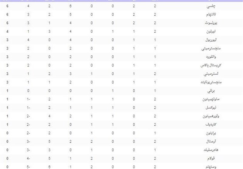 جدول رده‌بندی لیگ برتر انگلیس در پایان شب اول هفته دوم