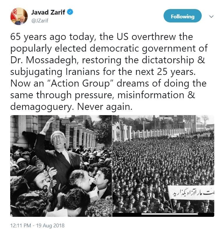 به گزارش خبرگزاری تسنیم، محمد جواد ظریف امروز در توییتی نوشت: « 65 سال قبل در چنین روزی، آمریکا دولت منتخب مردمی دکتر مصدق را سرنگون کرده، رژیم خودکامه را دوباره حاکم کرد و برای 25 سال بعد مردم ایران را تحت استیلای خویش قرار داد. اکنون نیز "گروه اقدام" آن کشور از طریق فشار، دروغ پردازی و عوامفریبی آرزوی تکرار همان سناریو را در سر می پروراند. دوباره هرگز.»