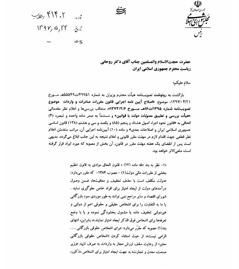رئیس مجلس شورای اسلامی با ارسال نامه ای به رئیس جمهور، برخی مفاد مصوبه «اصلاح آیین‌نامه اجرایی قانون مقررات صادرات و واردات» هیئت دولت را مغایر با قانون دانست.