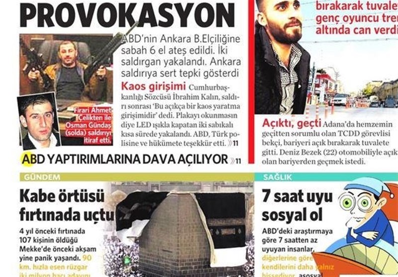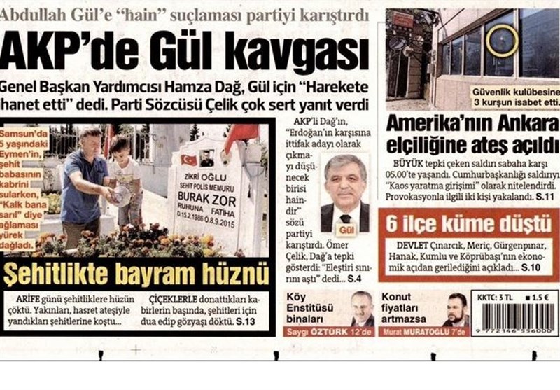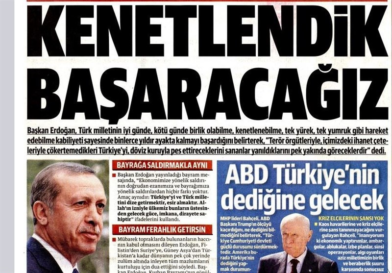 به گزارش گروه بینالملل خبرگزاری تسنیم، بسیاری از روزنامههای ترکیه، امروز در عکس و تیتر صفحه نخست، پیام اردوغان به مناسبت عید قربان را برجسته کردهاند. همچنین این روزنامهها موضوعات دیگری مانند حمله به سفارت آمریکا در آنکارا و شکایت ترکیه از آمریکا را مورد توجه قرار دادهاند.