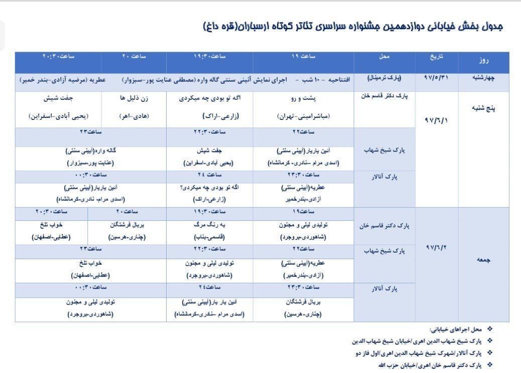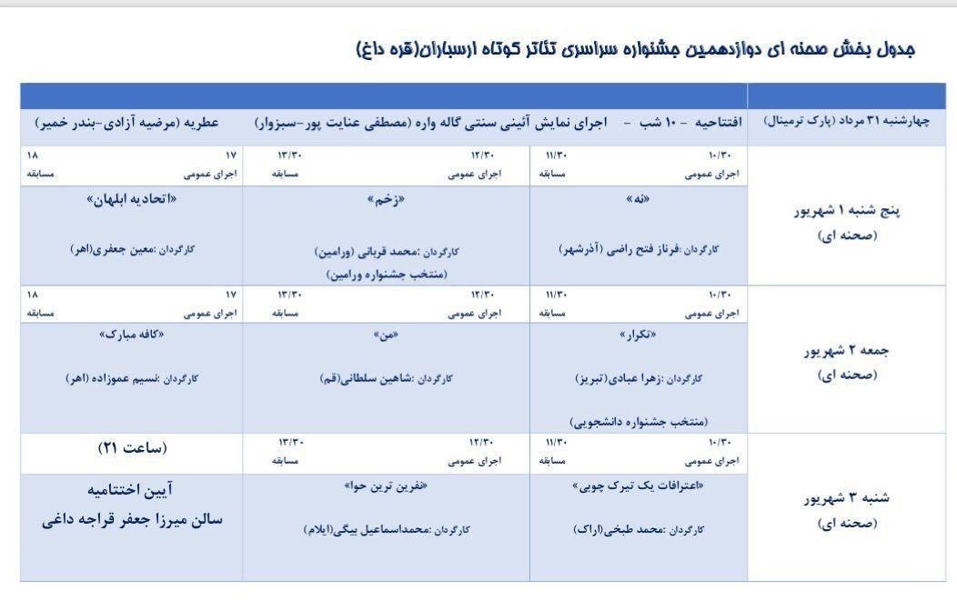 دوازدهمین جشنواره سراسری تئاتر کوتاه اهر ارسباران از شامگاه 31 ام مردادماه با برگزاری آیین افتتاحیه آغاز و در 3 شهریورماه با معرفی آثار برگزیده و برگزاری آیین اختتامیه در سالن میرزا جعفر قراجه داغی مجتمع فرهنگی و هنری اهر به کار خود خاتمه میدهد.