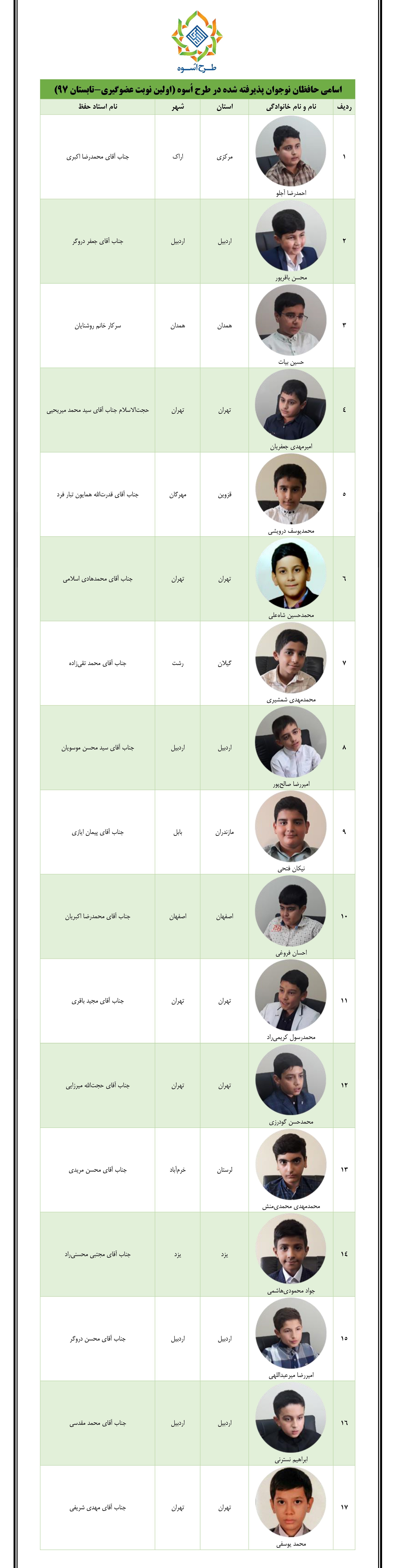 به گزارش باشگاه خبرنگاران پویا، پس از اتمام مراحل ارزیابی حافظان نوجوان ممتاز کل قرآن از سراسر کشور که متقاضی حضور در طرح اُسوه بودند، در نهایت تعداد 17 حافظ کل 9 تا 12 سال که از دیدگاه هیأت داوران حایز بالاترین نصاب شدند، مجوز عضویت در طرح اُسوه را کسب کردند.