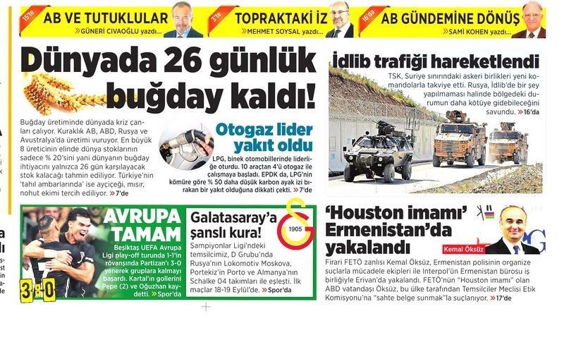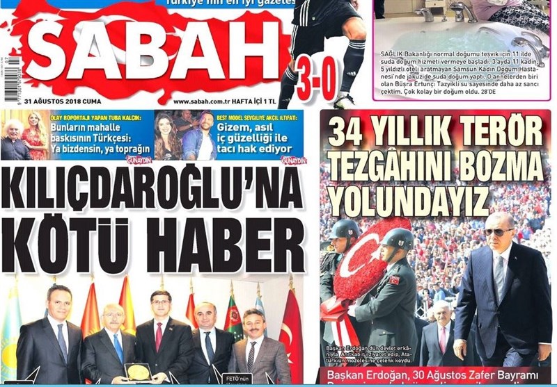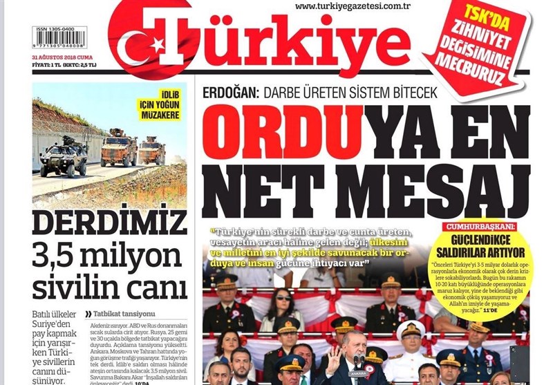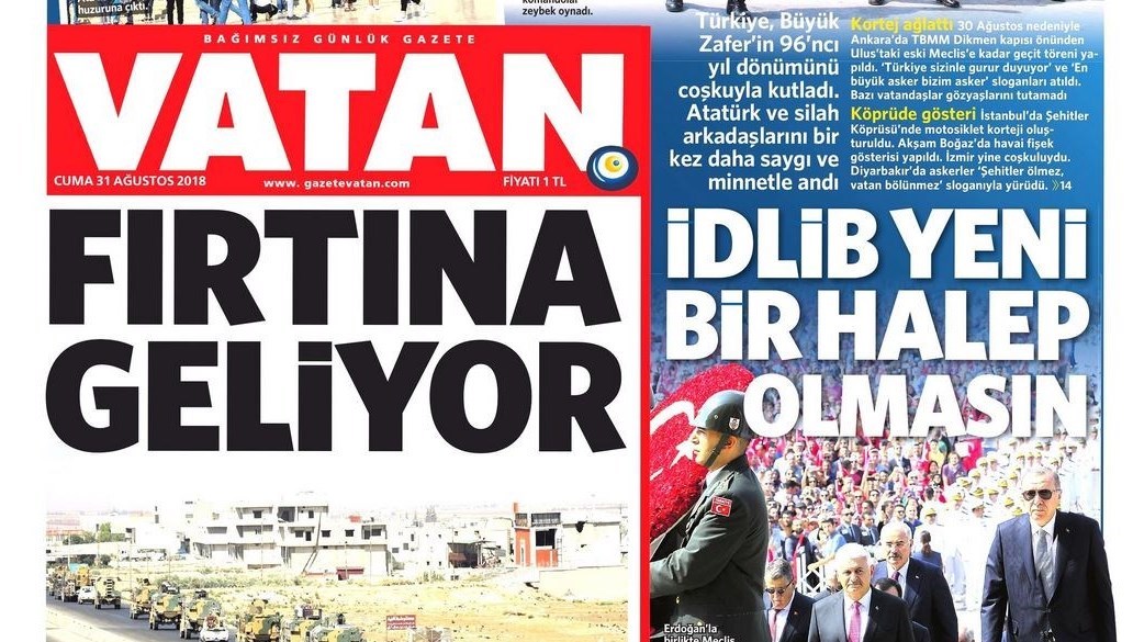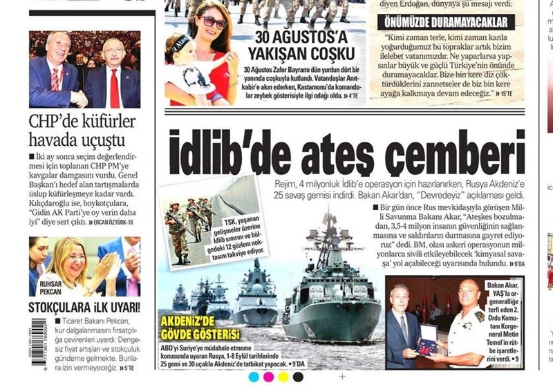 به گزارش گروه بینالملل خبرگزاری تسنیم، بسیاری از روزنامههای ترکیه، امروز در عکس و تیتر صفحه نخست، اهمیت سالگرد پیروزی آتاتورک در 30 آگوست را برجسته کردهاند. همچنین این روزنامهها موضوعات دیگری مانند احتمال جنگ در ادلب و تنش در حزب جمهوری خلق را مورد توجه قرار دادهاند.
