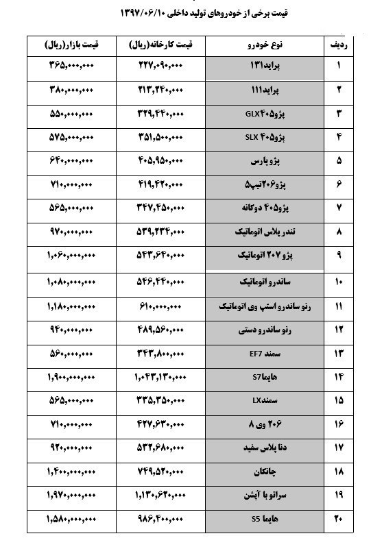 قیمت تعدادی از خودروهای داخلی در بازار امروز به‌‌شرح زیر است: