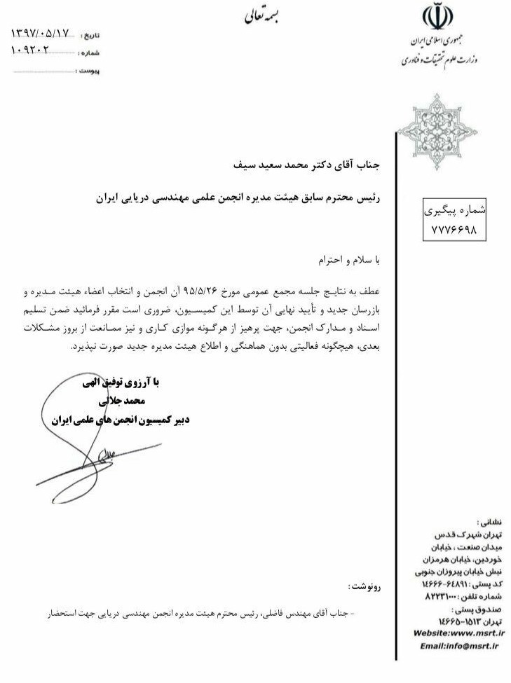 به گزارش خبرنگار اقتصادی خبرگزاری تسنیم، چندی پیش دبیر کمیسیون انجمن های علمی ایران در نامه ای به رئیس سابق هیئت مدیره انجمن مهندسی دریایی ایران خواستار تسلیم اسناد و مدارک به هیئت مدیره جدید این انجمن شده بود.