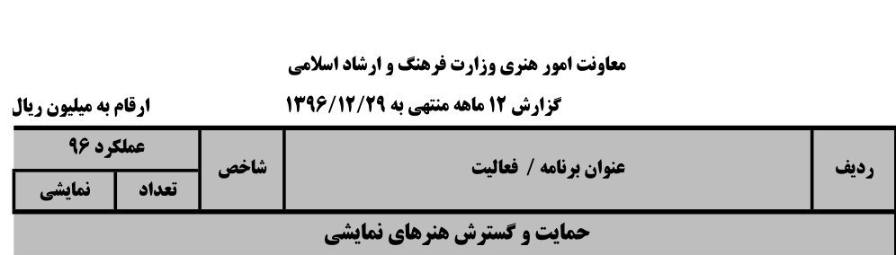 جدول مذکور نشان میدهد که در یک سال گذشته معاونت در 66 مورد مبلغی برابر با 233میلیارد و 526میلیون ریال در حوزه تئاتر هزینه کرده است. با نقبی به گذشته و ایام چانهزنیهای دولت در صحن علنی مجلس شورای اسلامی برای تصویب بودجه سال 1396 میتوان به این پاراگراف خبری رسید که آمده بود «سهم مربوط به تئاتر هم با عنوان برنامه «حمایت و گسترش هنرهای نمایشی» مشخص شده است، به این ترتیب رقم 64 میلیارد و 500 میلیون تومان برای تئاتر درنظر گرفته شده که نسبت به بودجه 55 میلیارد و 600 میلیون تومانی تئاتر در سال گذشته، حدود 10 میلیارد تومان افزایش وجود دارد».