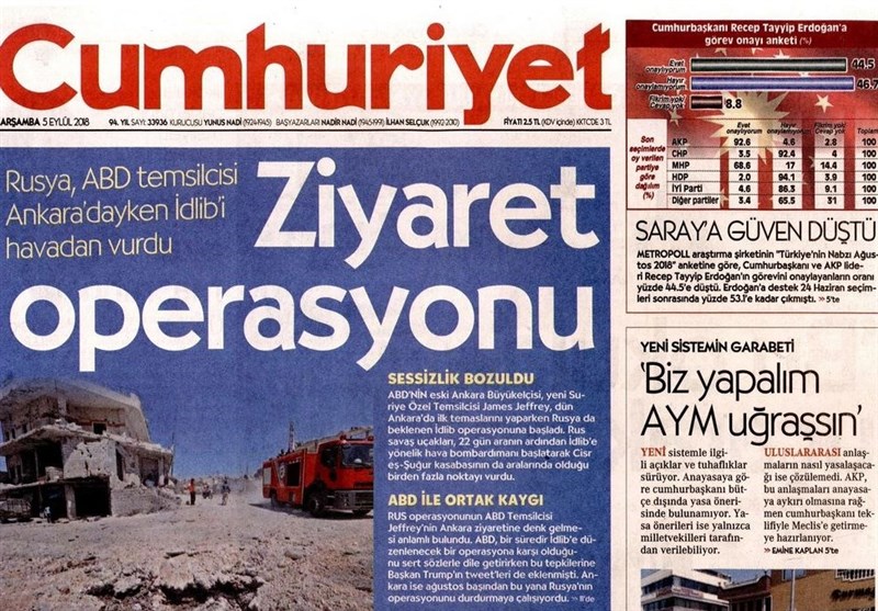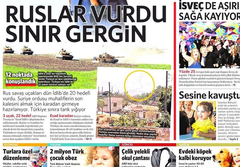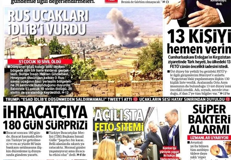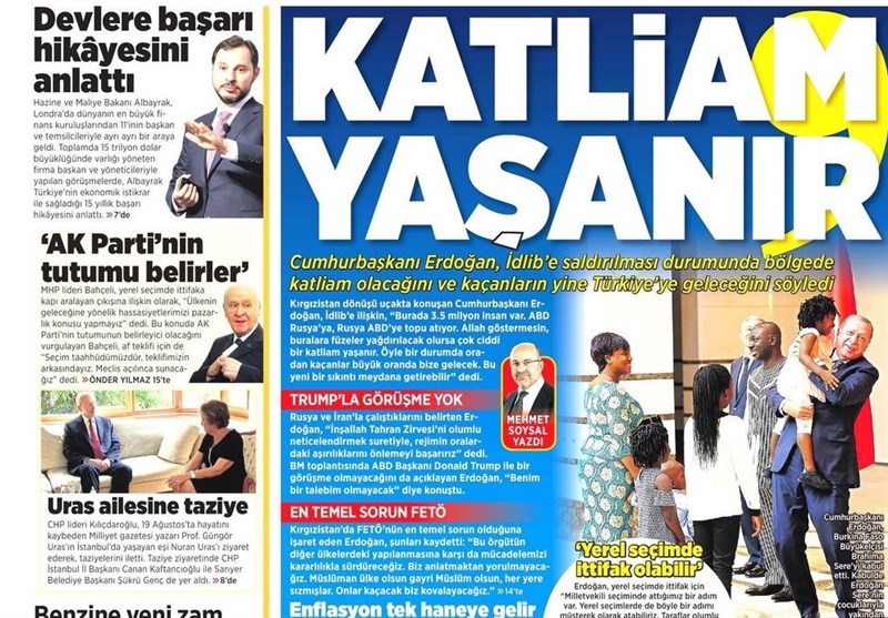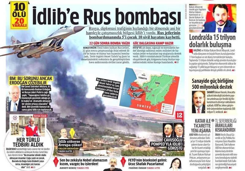 به گزارش گروه بینالملل خبرگزاری تسنیم، بسیاری از روزنامههای ترکیه، امروز در عکس و تیتر صفحه نخست، بمباران ادلب و هشدار اردوغان در مورد حمله به این شهر را برجسته کردهاند. همچنین این روزنامهها موضوعات دیگری مانند دیدار وزیر مالی ترکیه با سرمایه گذاران انگلیسی در لندن و احتمال ائتلاف در انتخابات شهرداریهای ترکیه را مورد توجه قرار دادهاند.