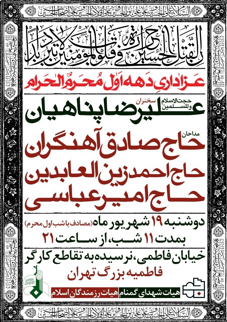 این برنامه از دوشنبه هفته آینده (19 شهریورماه) از ساعت 21 در فاطمیه بزرگ تهران واقع در خیابان فاطمی، نرسیده به تقاطع کارگر آغاز میشود.