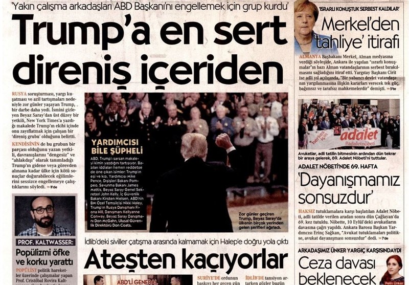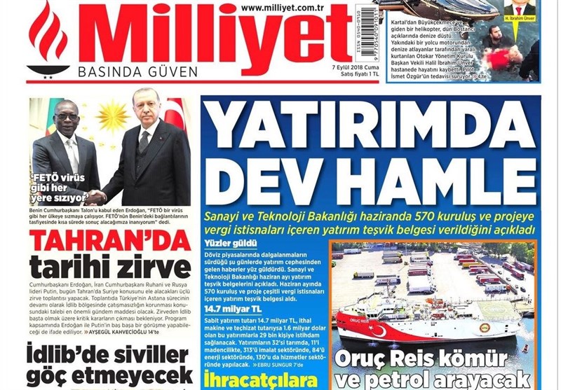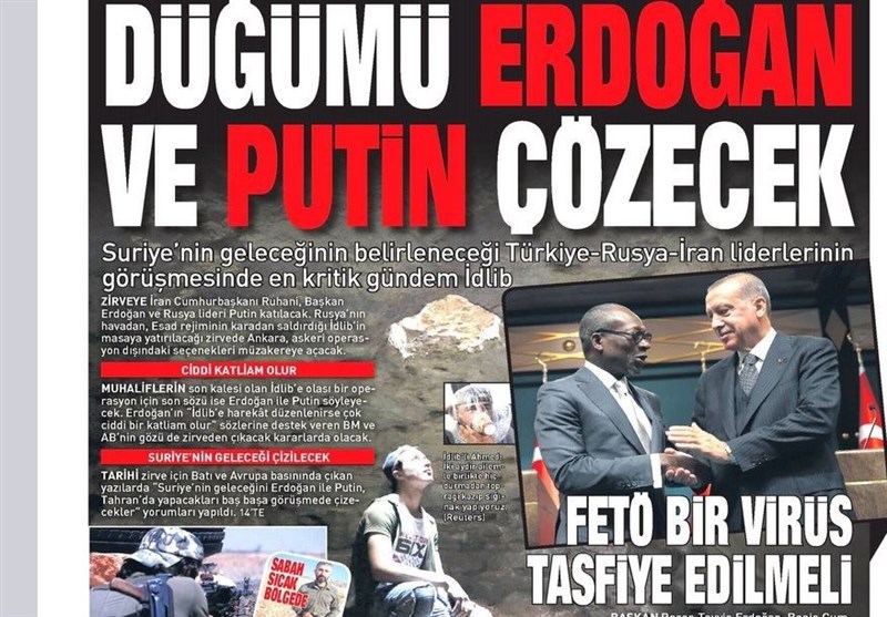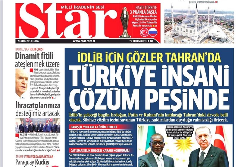 به گزارش گروه بینالملل خبرگزرای تسنیم، بسیاری از روزنامههای ترکیه، امروز در عکس و تیتر صفحه نخست، اهمیت نشست سه جانبه تهران را برجسته کردهاند. همچنین این روزنامهها موضوعات دیگری مانند آزمایش موفقیت آمیز بالگرد ملی ترکیه و همچنین وضعیت ادلب را مورد توجه قرار دادهاند.