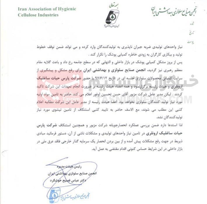 رئیس هیات مدیره انجمن سلولزی بهداشتی در نامه خود به رئیس تعزیرات تصریح کرد: " تا قبل از بروز بحران ارزی در کشور شرکت پارس حیات ساغلیک اروئلری همواره مدعی تامین تیشوی کشور و عامل صرفه جویی ارزی بوده است، متاسفانه در شرایط کنونی با وجود دریافت 49 میلیون دلار ارز دولتی و واردات مواد اولیه به میزان کافی، این شرکت از تامین تیشوی مورد نیاز واحدهای تولیدی سرباز می زند که این کار ضربه جبران ناپذیری به تولیدکنندگان وارد کرده و می تواند ضمن توقف خطوط تولید و بیکاری کارگران به زودی خاطره کمیابی پوشک را تکرار کند."