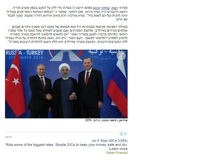 در این حال روزنامه یدیعوت آحارانوت در گزارشی به نشست سه جانبه تهران پرداخت و تلاش کرد تا همسو با خواست تروریست ها مسئله ابراز نگرانی از حمله به آخرین مقر تروریست ها در ادلب سوریه را با تیتر کردن سخنان رجب طیب اردوغان در رابطه با اعمال آتش بس با تروریست ها پر رنگ کند.