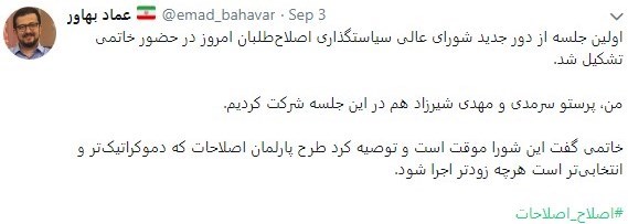 ساعتی پس از برگزاری جلسه مذکور، عماد بهاور ضمن تأیید خبر حضورش در لیست جدید اعضای حقیقی شورای سیاستگذاری، جزئیاتی از این جلسه را که با حضور رئیس دولت اصلاحات برگزار شد، بیان کرد.
