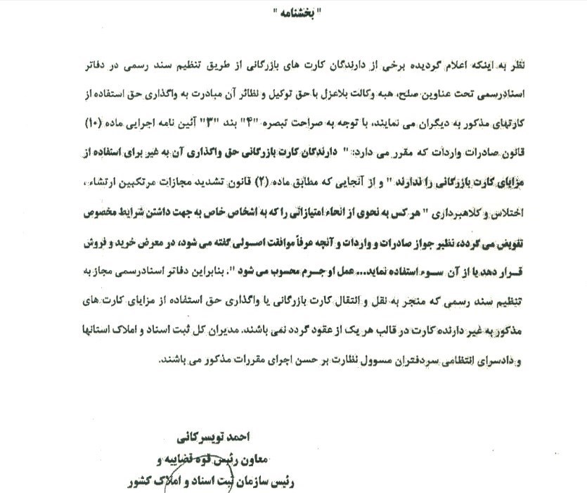 به گزارش خبرنگار حقوقی خبرگزاری تسنیم، در این بخشنامه با اشاره به اینکه برخی از دارندگان کارت بازرگانی از طریق تنظیم سند رسمی در دفاتر اسناد رسمی با عناوین صلح، هبه، وکالت بلاعزل با حق توکیل و نظایر آن مبادرت به واگذاری حق استفاده از کارتهای مذکور به دیگران میکنند، و همچنین با استناد به آییننامه اجرایی ماده 10 قانون مقررات صادرات و واردات که بر عدم حق واگذاری کارت بازرگانی به غیر تأکید دارد، تصریح شده است که «دفاتر اسناد رسمی مجاز به تنظیم سند رسمی که منجر به نقل و انتقال کارت بازرگانی یا واگذاری حق استفاده از مزایای کارتهای مذکور به غیر دارنده کارت در قالب هر یک از عقود، نیستند».