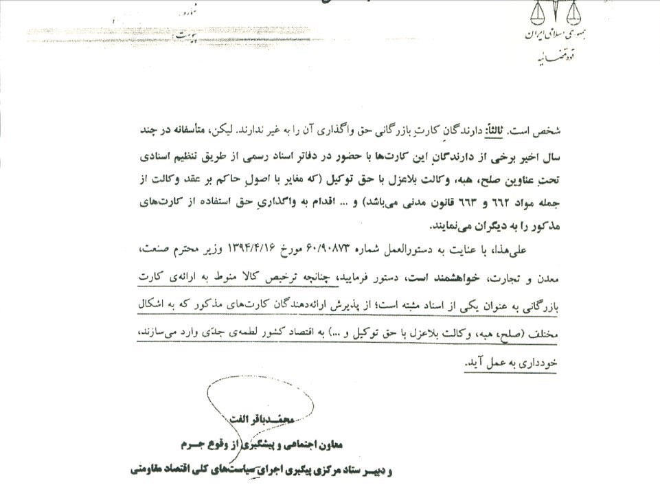همچنین محمدباقر الفت، معاون اجتماعی و پیشگیری از وقوع جرم قوه قضاییه در نامهای به فرود عسکری مدیرکل گمرک ایران، با تأکید بر اینکه حق استفاده از کارت بازرگانی، قائم به شخص است، گفته است: «چنانچه ترخیص کالا منوط به ارائه کارت بازرگانی بهعنوان یکی از اسناد مثبته است، از پذیرش ارائهدهندگان کارتهای مذکور که بهاشکال مختلف (صلح، هبه، وکالت بلاعزل با حق توکیل و...) به اقتصاد کشور لطمه جدی وارد میسازند، خودداری بهعمل آید».