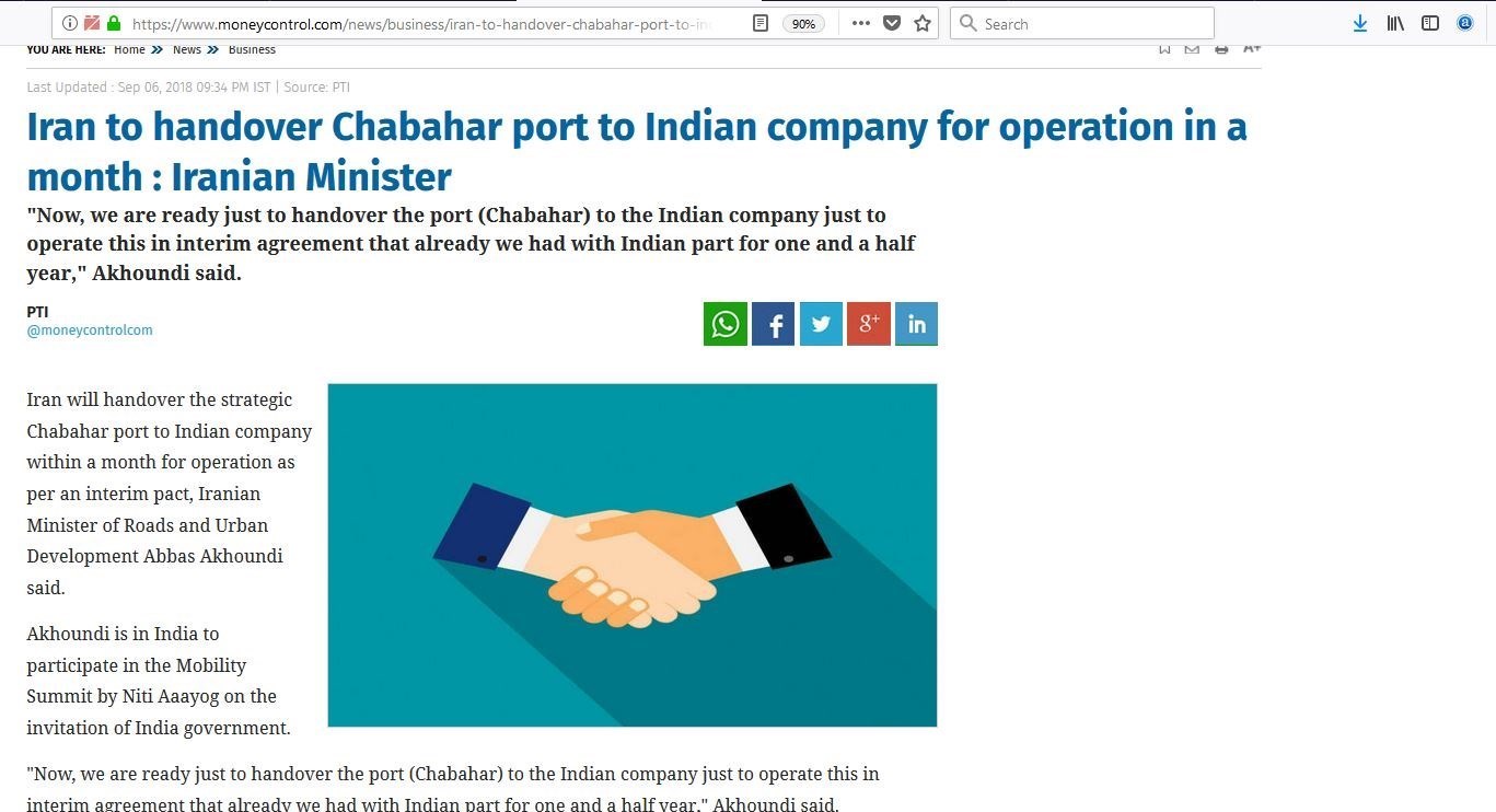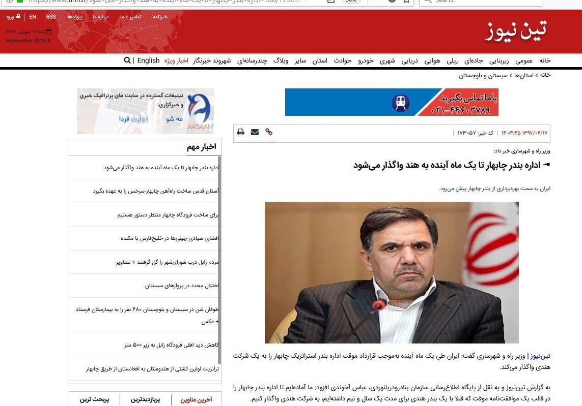 به گزارش خبرگزاری تسنیم، روز جمعه 16 شهریور یک سایت خبری هندی بهنام مانی کنترل، خبری بهنقل از عباس آخوندی وزیر راه و شهرسازی ایران منتشر کرد با این عنوان که "بهرهبرداری و اپراتوری بندر چابهار را طی یک ماه آینده به یک شرکت هندی واگذار میکند"، که این خبر پس از انتشار در خبرگزاری تسنیم، سایت خبری وزارت راه، سازمان بنادر و دریانوردی و سایتهای خبری دیگر، مورد نقد برخی در فضای مجازی قرار گرفت که چرا ایران باید مدیریت و اداره بندرش را به خارجیها واگذار کند.