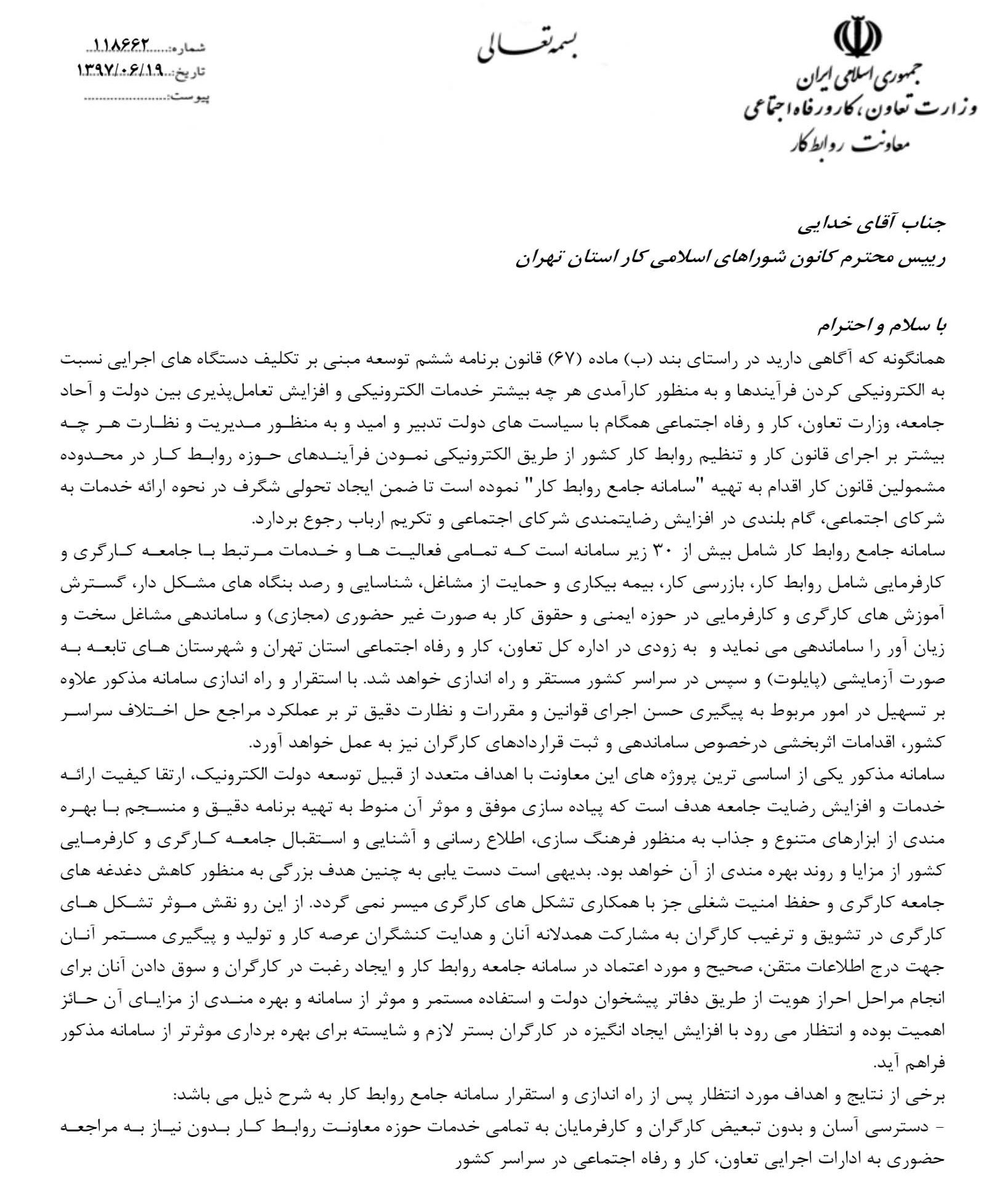 حالا بعد از گذشت حدود 20 روز از آن نامه شواهد حاکی از این است که وزارت کار این بار با قدرت از اجرای دقیق و کامل این طرح دفاع کرده است. اسماعیل ظریفی آزاد، مدیر کل روابط کار و جبران خدمت وزارت کار از راه اندازی این سامانه در آینده ای نزدیک خبر داد و گفت: این سامانه که قرار است در تمام کشور به تدریج راه اندازی شود، در فاز نخست در استان تهران به صورت آزمایشی فعالیت خود را آغاز می کند به این ترتیب که در مرحله اول خدمات مربوط به ثبت شکایات و دادخواست کارگران از اول مهرماه از طریق این سامانه انجام خواهد شد.پس از راه اندازی زیرسامانه ثبت الکترونیکی دادخواست کارگران در استان تهران، ثبت نام کارگران چهار استان سمنان، البرز، قزوین و اردبیل به فاصله کمتر از دو هفته از طریق دفاتر پیشخوان آغاز می شود.