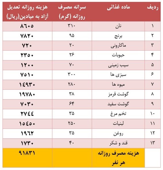 با توجه به این جدول «حداقل هزینه مصرف ماهیانه مواد غذایی» یک خانوار 3.3 نفره با توجه به آمار مرکز آمار هزینه مصرف روزانه یک نفر در ماه حدود 910 هزار تومان است که هزینه یک خانوار 3.3 نفره این هزینه حدود 3میلیون و 450 هزار تومان برآورد می شود.