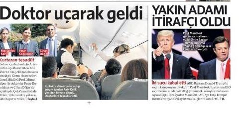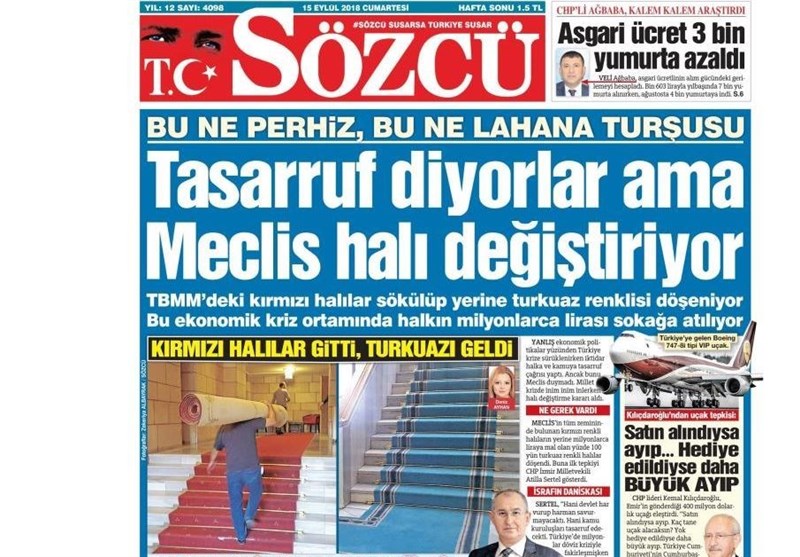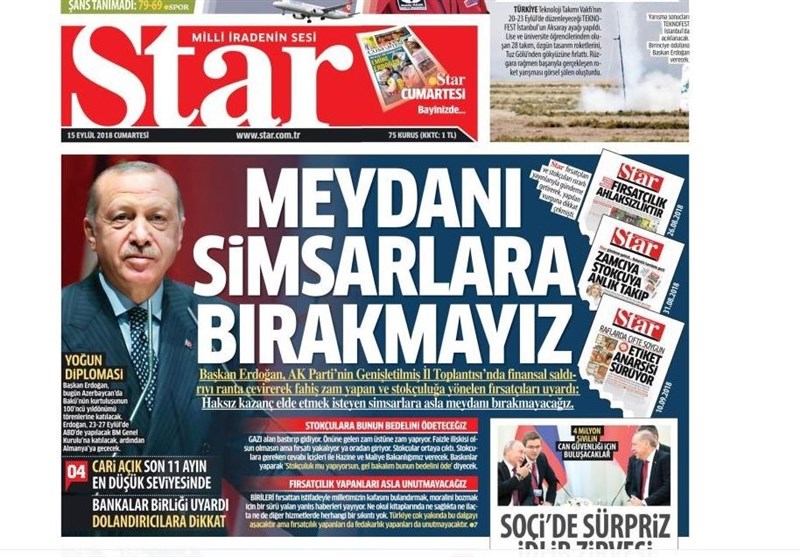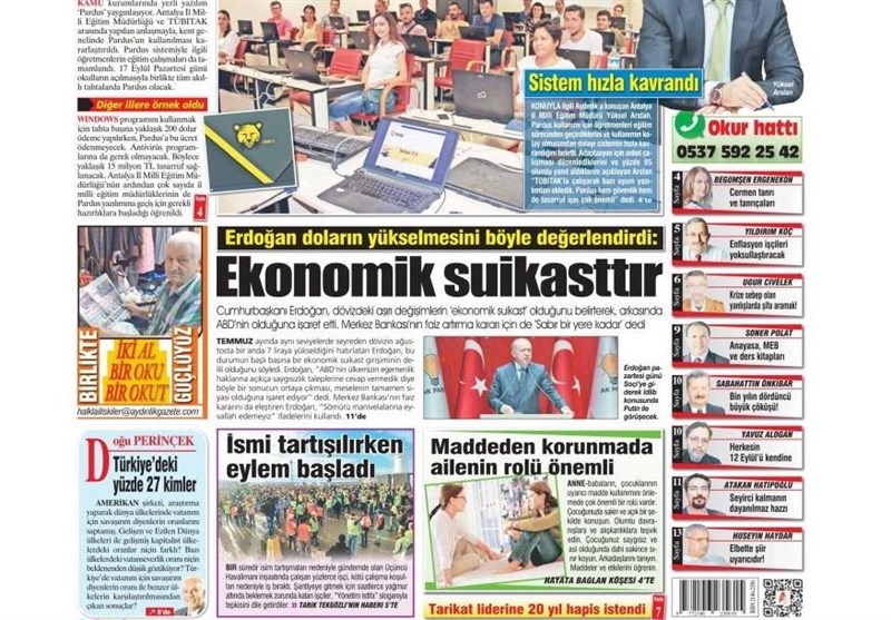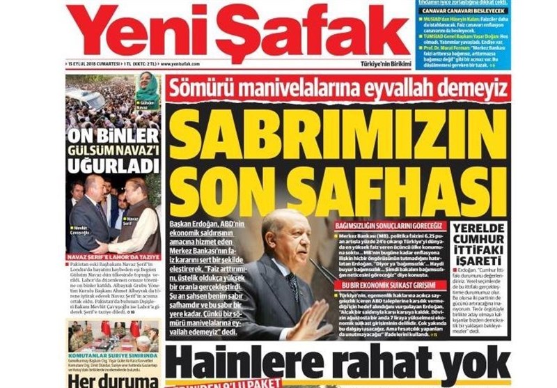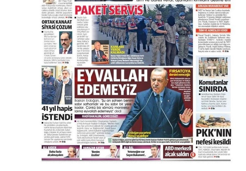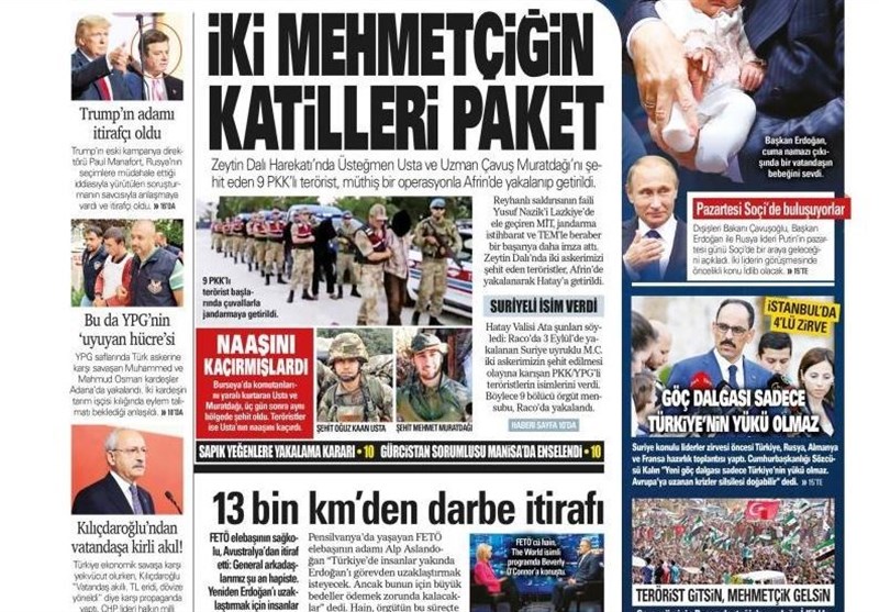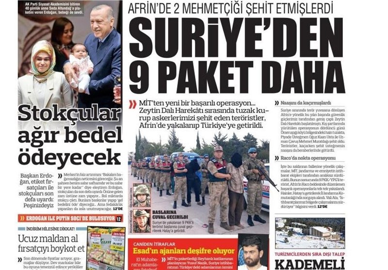 به گزارش گروه بینالملل خبرگزاری تسنیم، بسیاری از روزنامههای ترکیه، امروز در عکس و تیتر صفحه نخست، دستگیری 9 نفر در عفرین به اتهام کشتن دو سرباز ترک و نیز هواپیمای اهدایی امیر قطر به اردوغان را برجسته کردهاند.