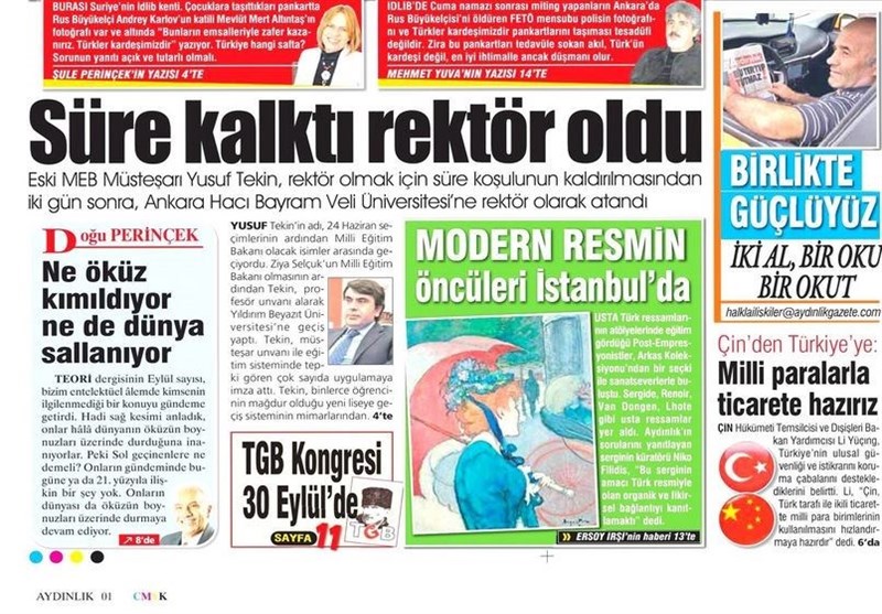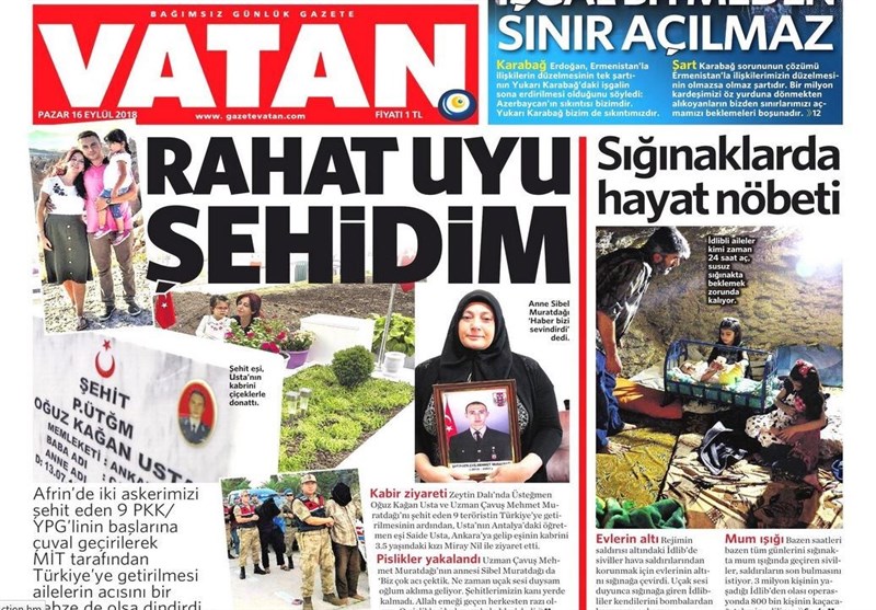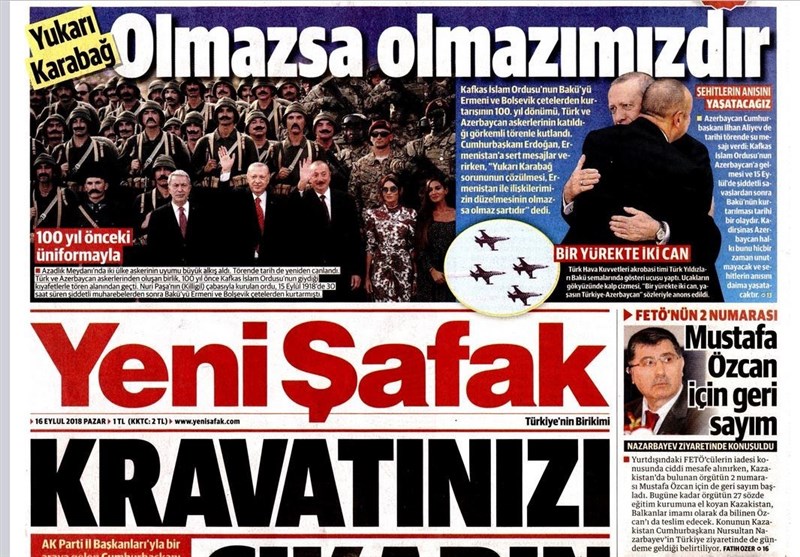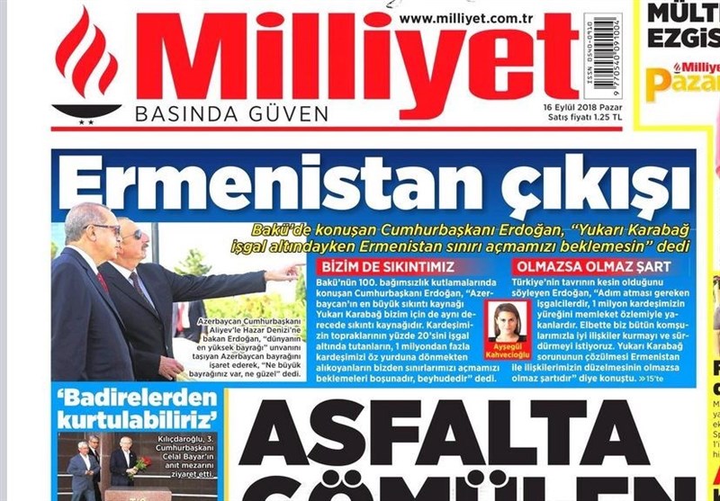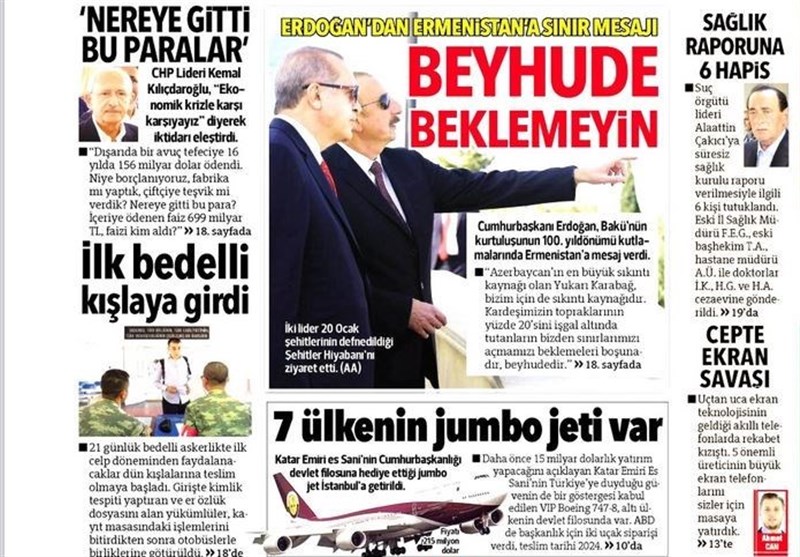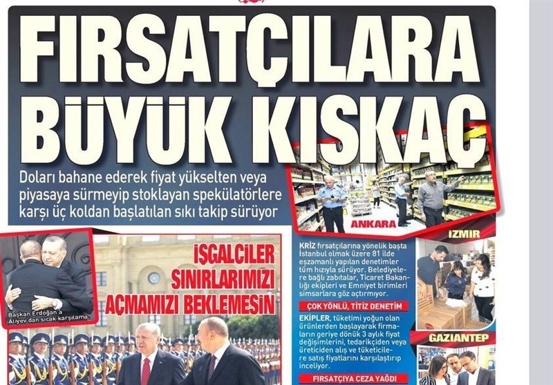 به گزارش گروه بینالملل خبرگزاری تسنیم، بسیاری از روزنامههای ترکیه، امروز در عکس و تیتر صفحه نخست، سفر اردوغان به باکو و مواضع او در مورد قره باغ را برجسته کردهاند. همچنین این روزنامهها موضوعات دیگری مانند اعتصاب کارگران فرودگاه استانبول را مورد توجه قرار دادهاند.