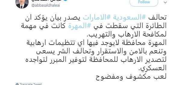 او نوشته است : ائتلاف شکست خوردگان از المهره که تنها منطقه امن در یمن است، چه میخواهد؟ از جامعه جهانی میخواهیم با اقدامات کودکانه ائتلاف جاهلان مقابله کنند.