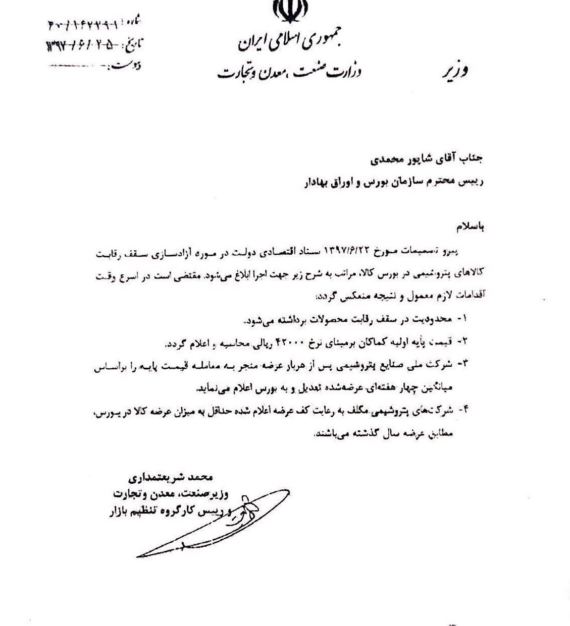 درحالی که این خبر روز گذشته در شبکه های اجتماعی به صورت گسترده دست به دست شده، تاریخ نامه وزیر صنعت به رئیس سازمان بورس نشان می دهد، بخشنامه مذکور در روز جاری از سوی شریعتمداری صادر شده است.