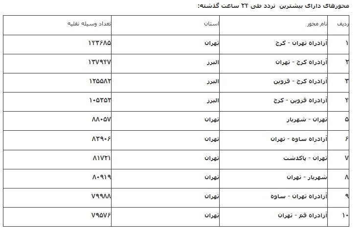 تردد کلیه تریلرها و کامیونها به استثنای حاملین مواد سوختی وفاسد شدنی از ساعت 12 الی 22 روز سه شنبه مورخ 97/06/27 و همچنین از ساعت 8 الی 22 روزهای چهارشنبه ، پنج شنبه و جمعه مورخهای 97/06/28 ، 97/06/29 و 97/06/30 در محور فوق ممنوع می باشد.