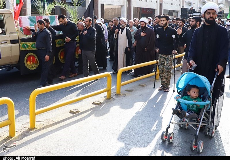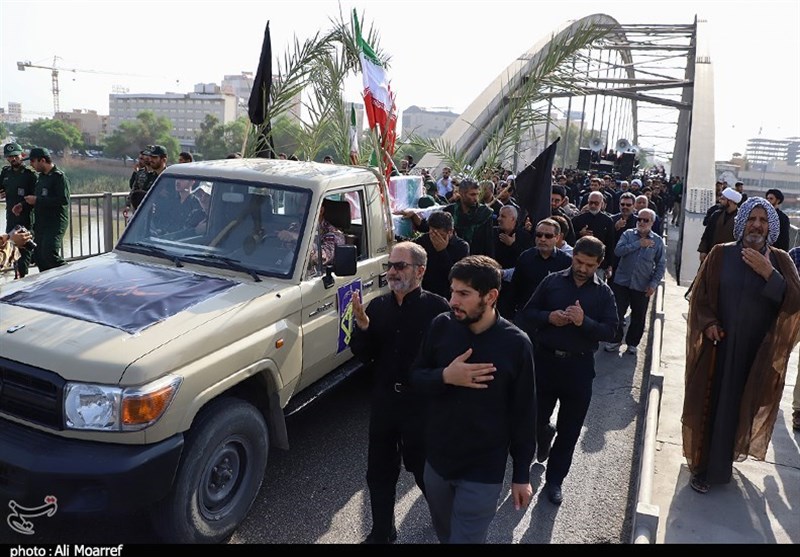 مراسم تشییع پیکرمطهر 9 شهید گمنام دفاع مقدس همزمان با هفتمین روز ماه محرم و ایام عزاداری حضرت سید الشهدا (ع) در اهواز برگزار شد.