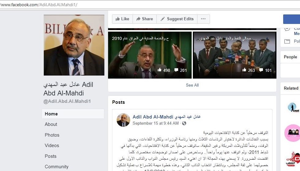 از سوی دیگر آخرین پست عبدالمهدی در صفحه شخصیاش در فیسبوک به نوعی به احتمال نخستوزیر شدن وی اشاره میکند.