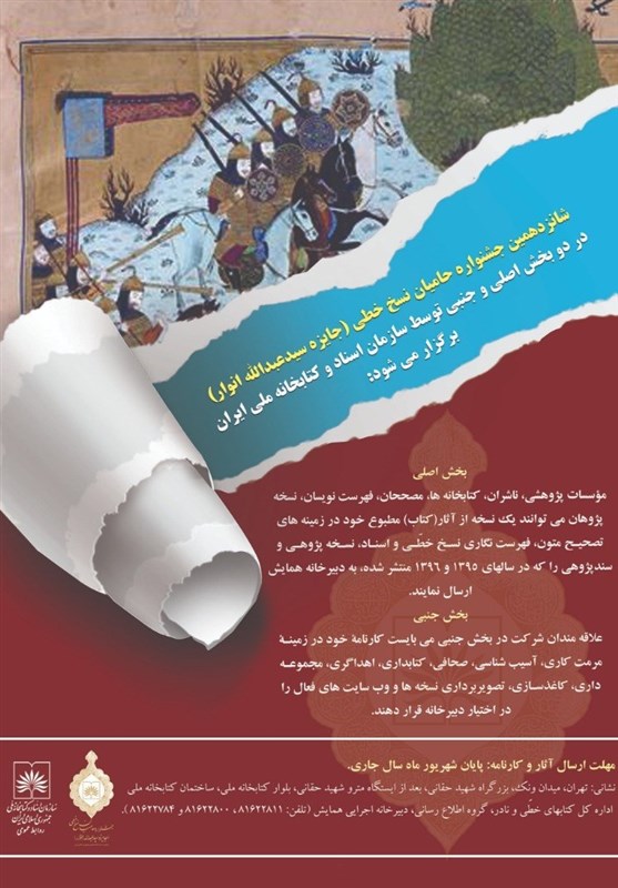 به گزارش باشگاه خبرنگاران پویا، به نقل از روابط عمومی سازمان اسناد و کتابخانه ملی ایران، شانزدهمین جشنواره حامیان نسخ خطی (جایزه سیدعبدالله انوار) در دو بخش اصلی و جنبی توسط سازمان اسناد و کتابخانه ملی ایران برگزار میشود.