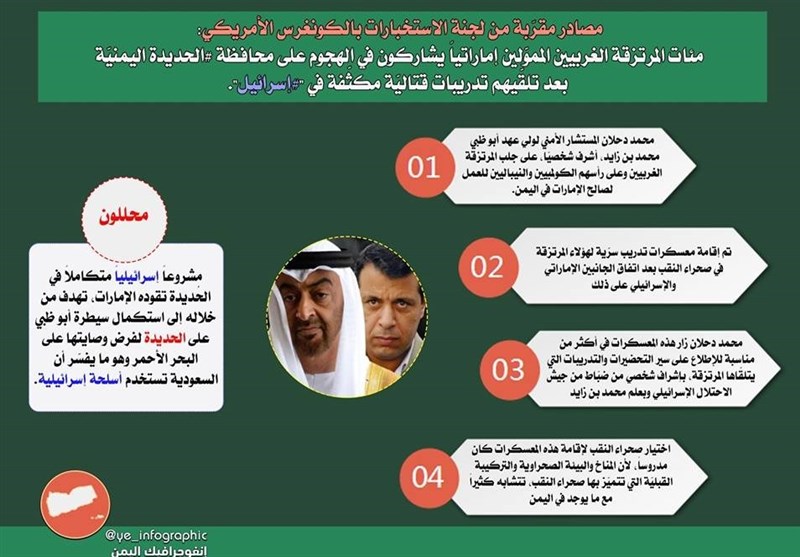منابع الخلیج آن لاین در کنگره آمریکا افزودند که محمد دحلان و افسران ارتش رژیم صهیونیستی بر روند آموزش مزدوران خارجی در اسرائیل نظارت کردهاند و سپس این افراد برای مشارکت در نبردها به استان الحدیده منتقل شدهاند.