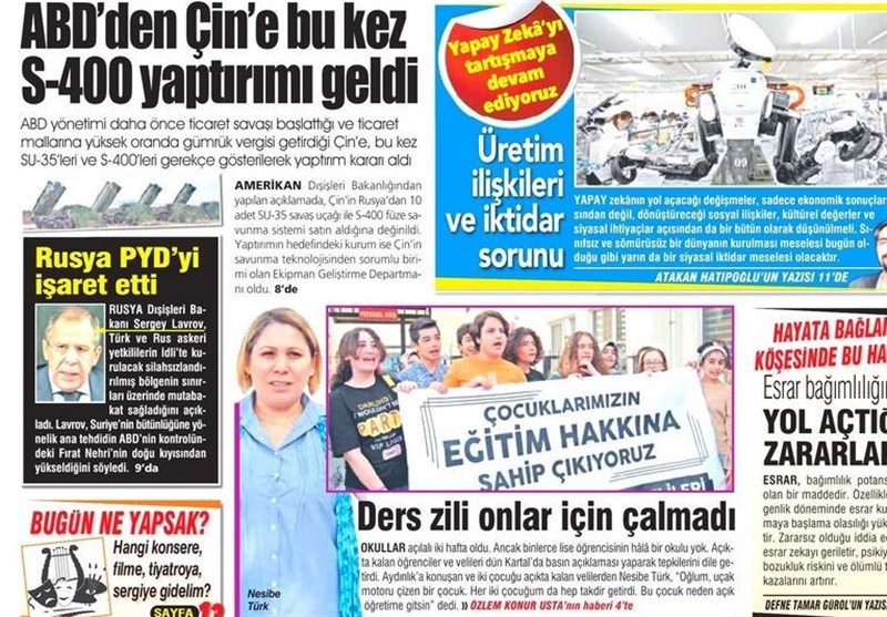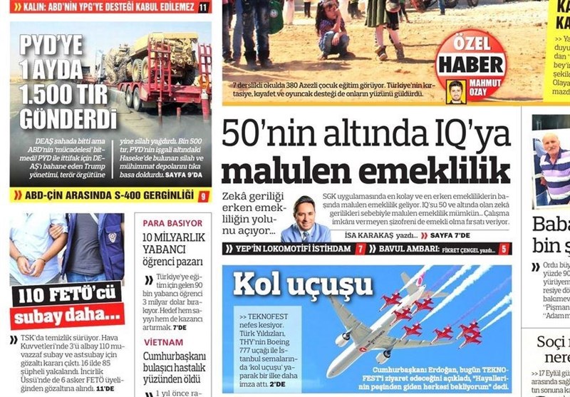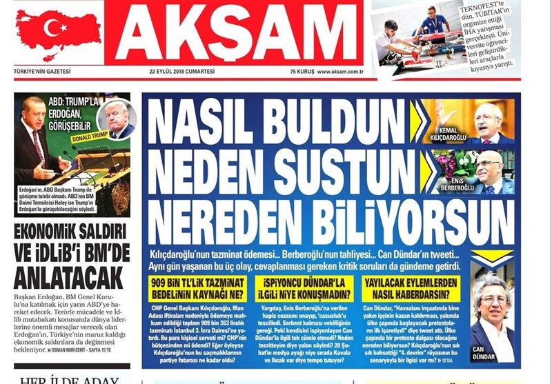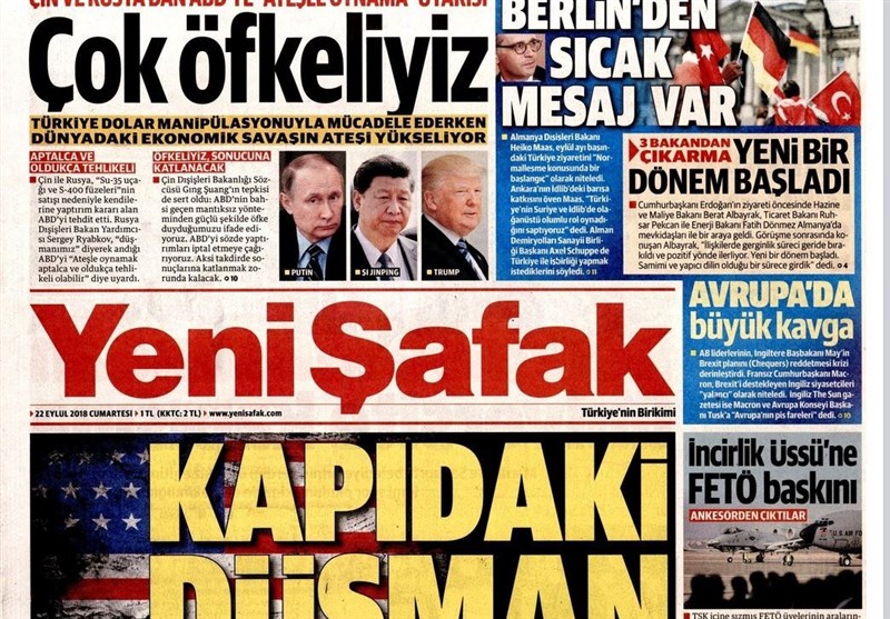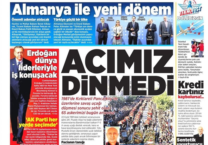 به گزارش گروه بینالملل خبرگزاری تسنیم، بسیاری از روزنامههای ترکیه، امروز در عکس و تیتر صفحه نخست، دیدار وزرای آلمان و ترکیه را برجسته کردهاند. همچنین این روزنامهها موضوعات دیگری مانند موضوع سخنرانی اردوغان در سازمان ملل و حمایت تسلیحاتی آمریکا از کردهای سوریه را مورد توجه قرار دادهاند.