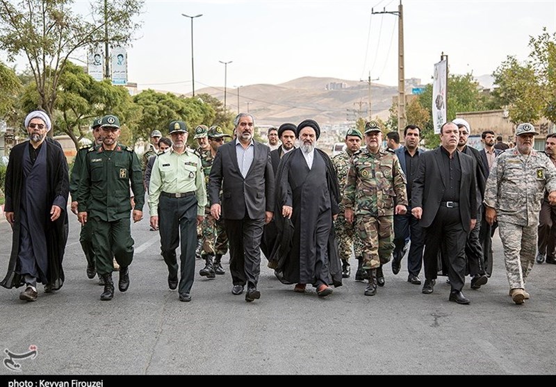 در این مراسم، آیت‌الله سیدمحمد حسینی‌شاهرودی نماینده ولی فقیه در کردستان، سردار محمدحسین رجبی فرمانده سپاه بیت‌المقدس استان کردستان، استاندار و معاون سیاسی، امنیتی و اجتماعی استاندار کردستان، سردار مسعود خرم‌نیا فرمانده انتظامی استان کردستان، امیر سرتیپ ابوالفضل برزگری فرمانده قرارگاه عملیاتی لشکر 28 پیاده کردستان، امیر اسدی یادگار دوران دفاع مقدس، رئیس‌کل دادگستری کردستان، امام جمعه سنندج، خانواده‌های معظم شهدا و دیگر مسئولان ارشد استان و فرماندهان نظامی و انتظامی  حضور داشتند و یگان‌های نمونه سپاه بیت‌المقدس، بسیج، لشکر 28 پیاده ارتش، نیروی انتظامی و مرزبانی از مقابل جایگاه حضار رژه رفتند و به‌صورت هماهنگ و در صفوفی منظم، گوشه‌ای از آمادگی و توان دفاعی خود را برای حفظ و حراست از مرزها و کیان ایران اسلامی به ‌نمایش گذاشتند.