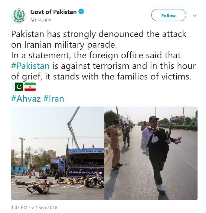 همچنین «محمد فیصل» سخنگوی وزارت خارجه پاکستان در واکنشی فوری به حمله تروریستی اهواز گفت: اسلام آباد این حمله تروریستی و ناجوانمردانه را به شدت محکوم می کند.