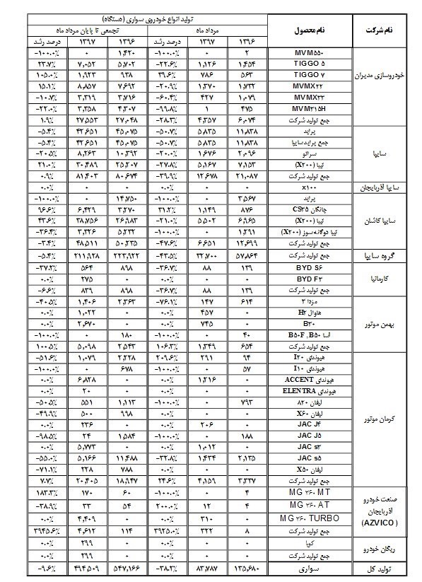 خودروسازان کشور در مردادماه سال جاری 89 هزار و 450 دستگاه انواع خودروی سواری، وانت و تجاری تولید کرده‌اند که این میزان تولید نسبت به ماه مشابه سال گذشته 38 درصد کاهش نشان می‌دهد.
