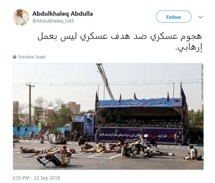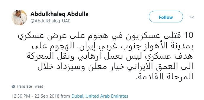 به گزارش گروه بینالملل خبرگزاری تسنیم، یکی از نویسندگان مشهور اماراتی که عضو «شورای فرهنگی دوبی» و هماهنگکننده «مجمع توسعه خلیج» در امارات متحده عربی است در سلسله توئیتهایی از حمله تروریستی پیش از ظهر امروز در اهواز دفاع کرد.