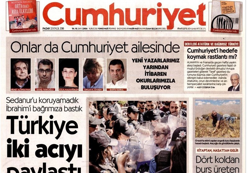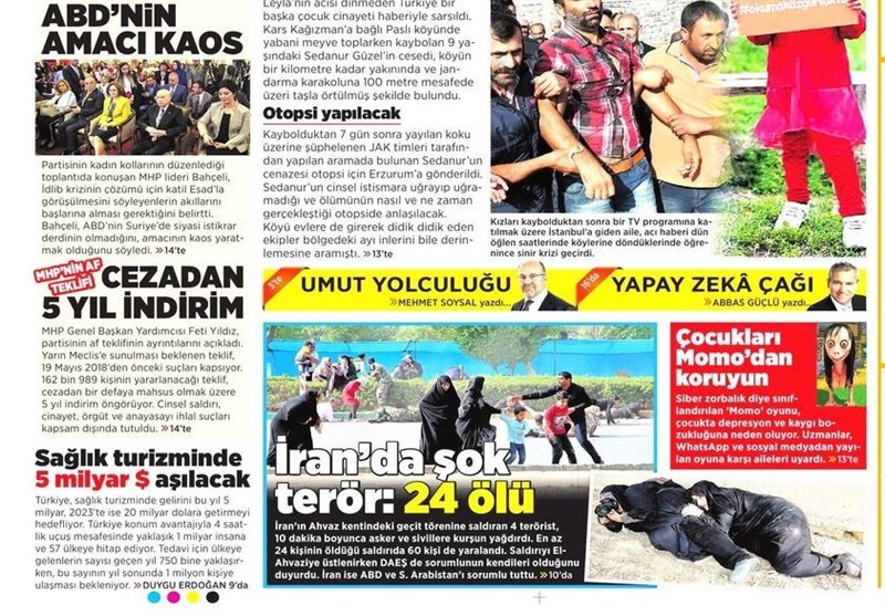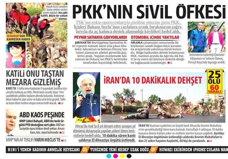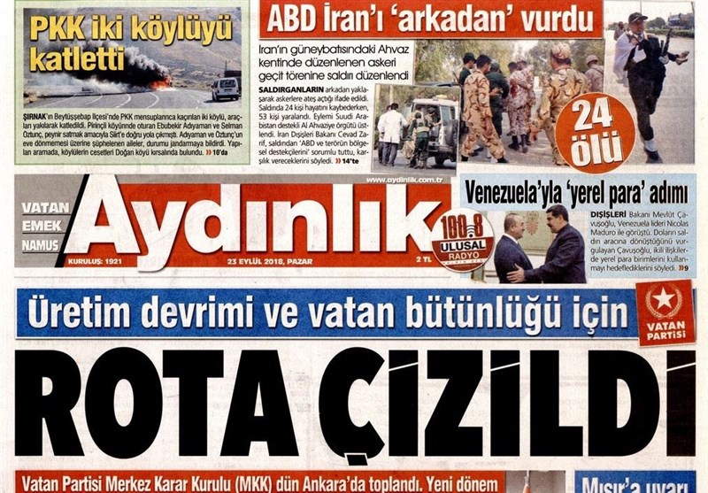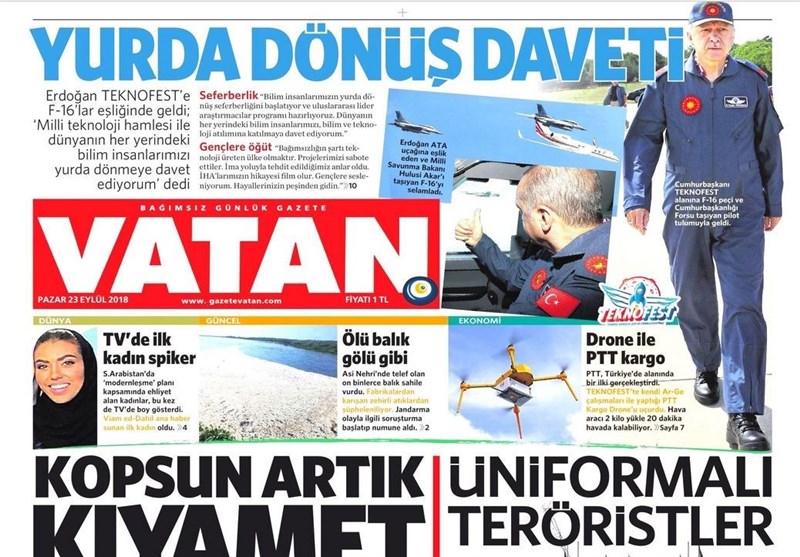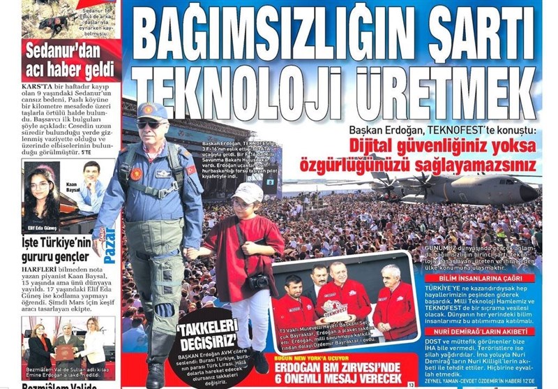 به گزارش گروه بینالملل خبرگزاری تسنیم، بسیاری از روزنامههای ترکیه، امروز در عکس و تیتر صفحه نخست، حضور اردوغان در یک نمایشگاه فن آوری و صنایع هوایی را برجسته کردهاند. همچنین این روزنامهها موضوعات دیگری مانند حمله تروریستی در اهواز را مورد توجه قرار دادهاند.