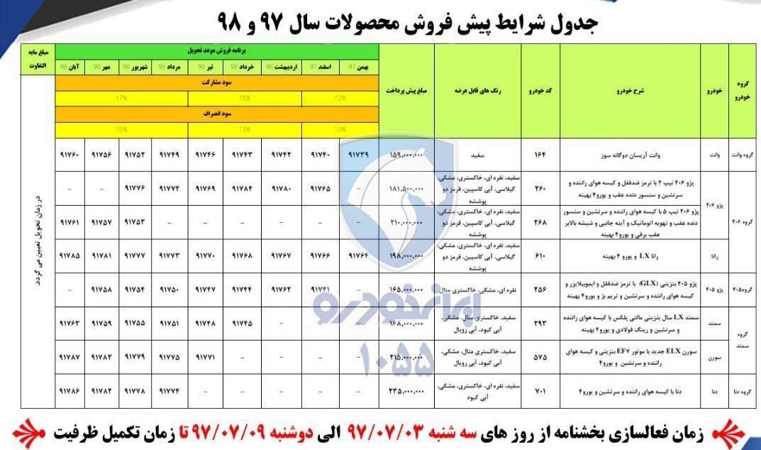 5- در شرایط پیش فروش مبلغ مابهالتفاوت، در زمان صدور دعوتنامه براساس قیمت مصوب شرکت در زمان تحویل خودرو و پس از محاسبه سود مشارکت و هزینههای قانونی از طریق دعوتنامه به اطلاع مشتریان خواهد رسید.