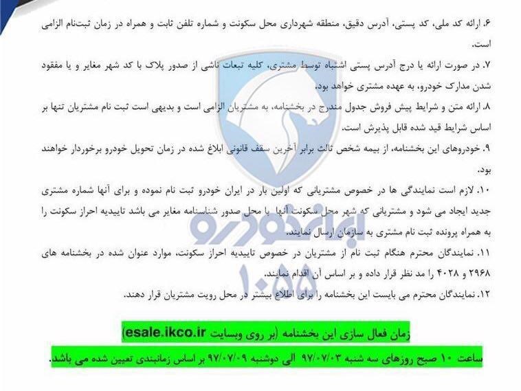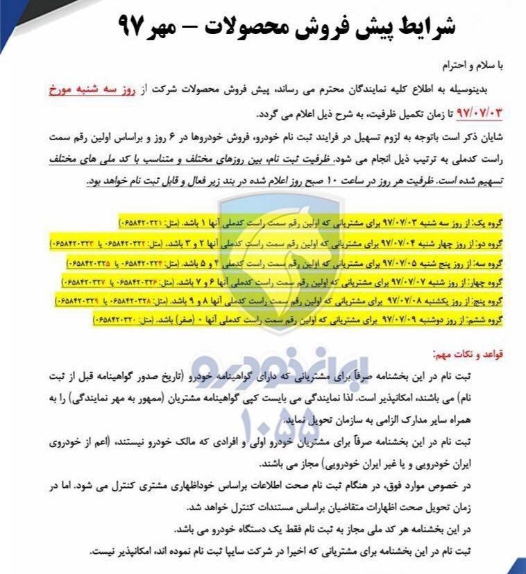 8- ارائه متن و شرایط پیش فروش خودرو مندرج در بخشنامه به مشتریان الزامی است و بدیهی است ثبتنام مشتریان تنها براساس شرایط قید شده قابل پذیرش است.