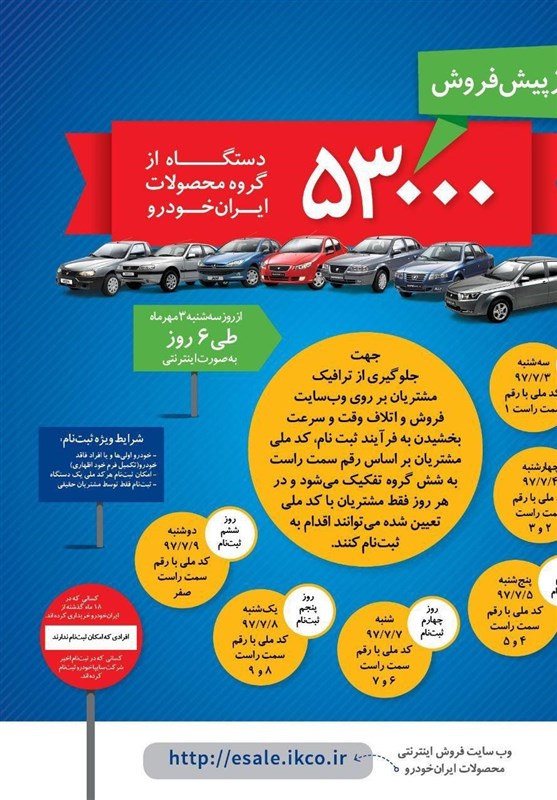 به گزارش خبرنگار اقتصادی خبرگزاری تسنیم، براساس اعلام شرکت ایرانخودرو شرایط فروش محصولات مهر ماه این شرکت اعلام شد. مطابق بخشنامهای که ایرانخودرو ابلاغ نموده است، به منظور تسهیل در فرایند ثبتنام خودرو فروش خودروها در شش روز و براساس اولین رقم سمت راست کد ملی انجام میشود. ظرفیت ثبت نام بین روزهای مختلف و متناسب با کد ملیهای مختلف صورت میگیرد. براساس این بخشنامه زمان شروع ثبتنام روز سهشنبه سوم مهرماه 10 صبح آغاز و تا دوشنبه 9 مهر ماه انجام میشود.