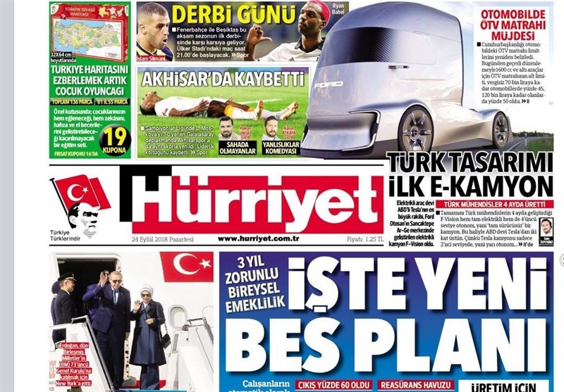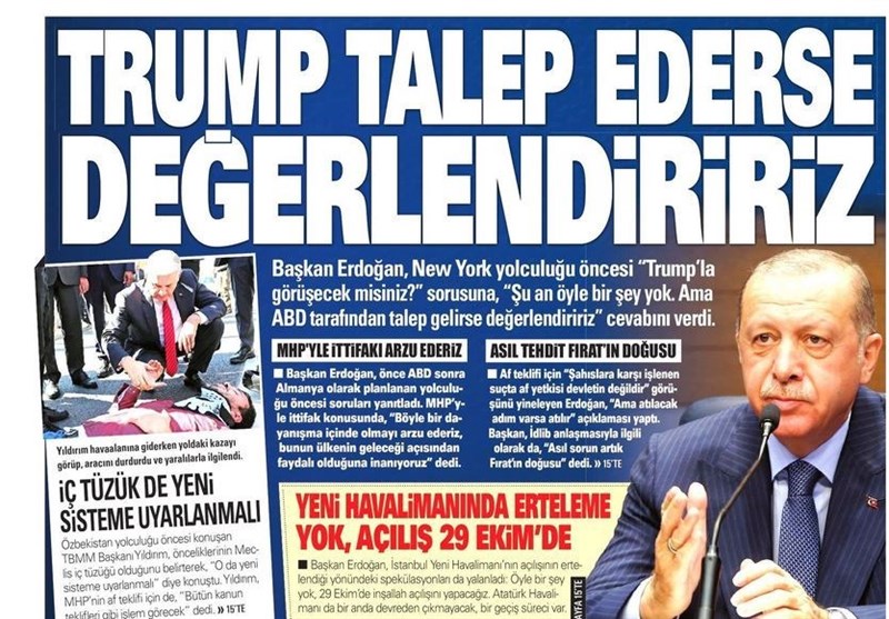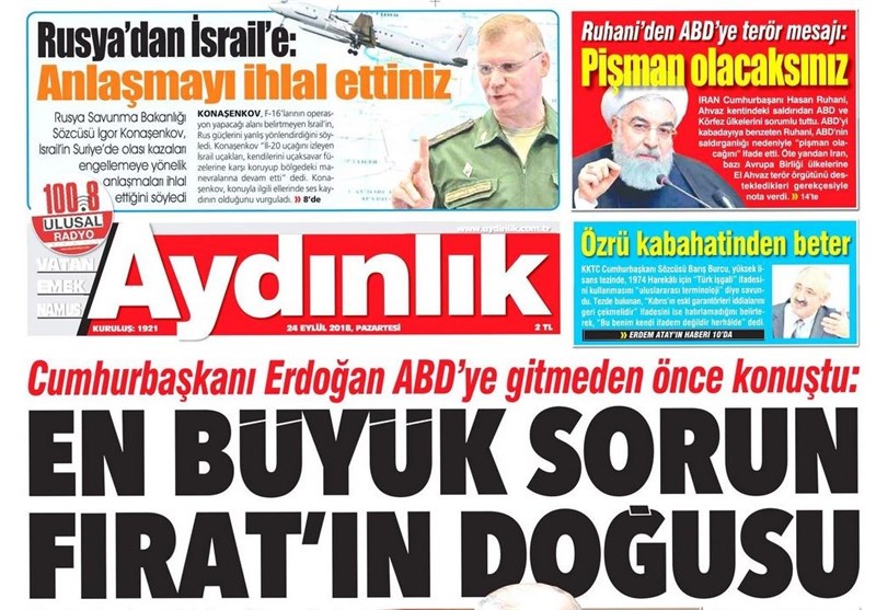 به گزارش گروه بین‌الملل خبرگزاری تسنیم، بسیاری از روزنامه‌های ترکیه، امروز در عکس و تیتر صفحه نخست، سخنان اردوغان قبل از حرکت به سوی نیویورک را برجسته کرده‌اند. همچنین این روزنامه‌ها موضوعات دیگری مانند دستگیری یکی از سران داعش در بیمارستانی در آدانا را مورد توجه قرار داده‌اند.