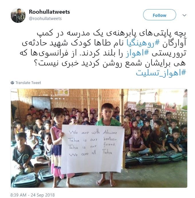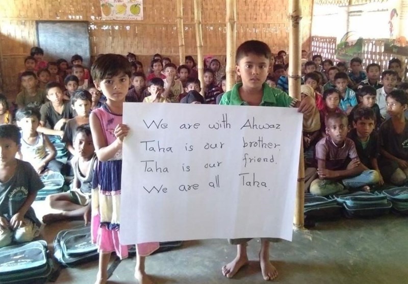 به گزارش گروه بینالملل خبرگزاری تسنیم، در پی شهادت یک کودک چهار ساله به نام «طاها اقدامی» در حادثه تروریستی اهواز، گروهی از کودکان و بچهدبستانیهای پناهجوی روهینگایی، شهادت وی را تسلیت گفتند.