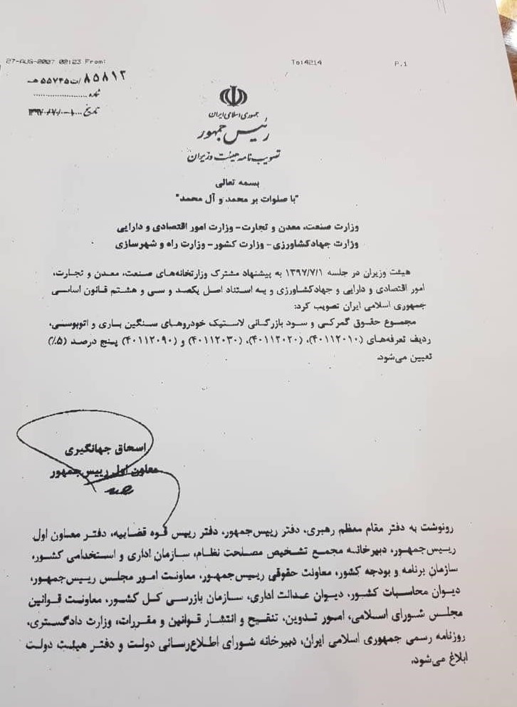 به گزارش خبرنگار اقتصادی باشگاه خبرنگاران پویا، براساس تصویبنامه هیأت وزیران درخصوص تعیین مجموع حقوق گمرکی و سود بازرگانی لاستیک خودروهای سنگین باری و اتوبوسی با ردیفهای 40112020، 40112030، 40112090 و 40112010 تعرفه بهمیزان پنج درصد تعیین شد.